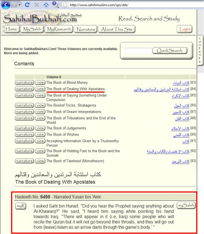 Presented below (taken from Sahih Al-Bukhari, Volume 9, Translated by Dr. Muhammad Muhsin Khan) is the clear proof that the Khawarij officially originated and were from Iraq NOT Saudi Arabia: